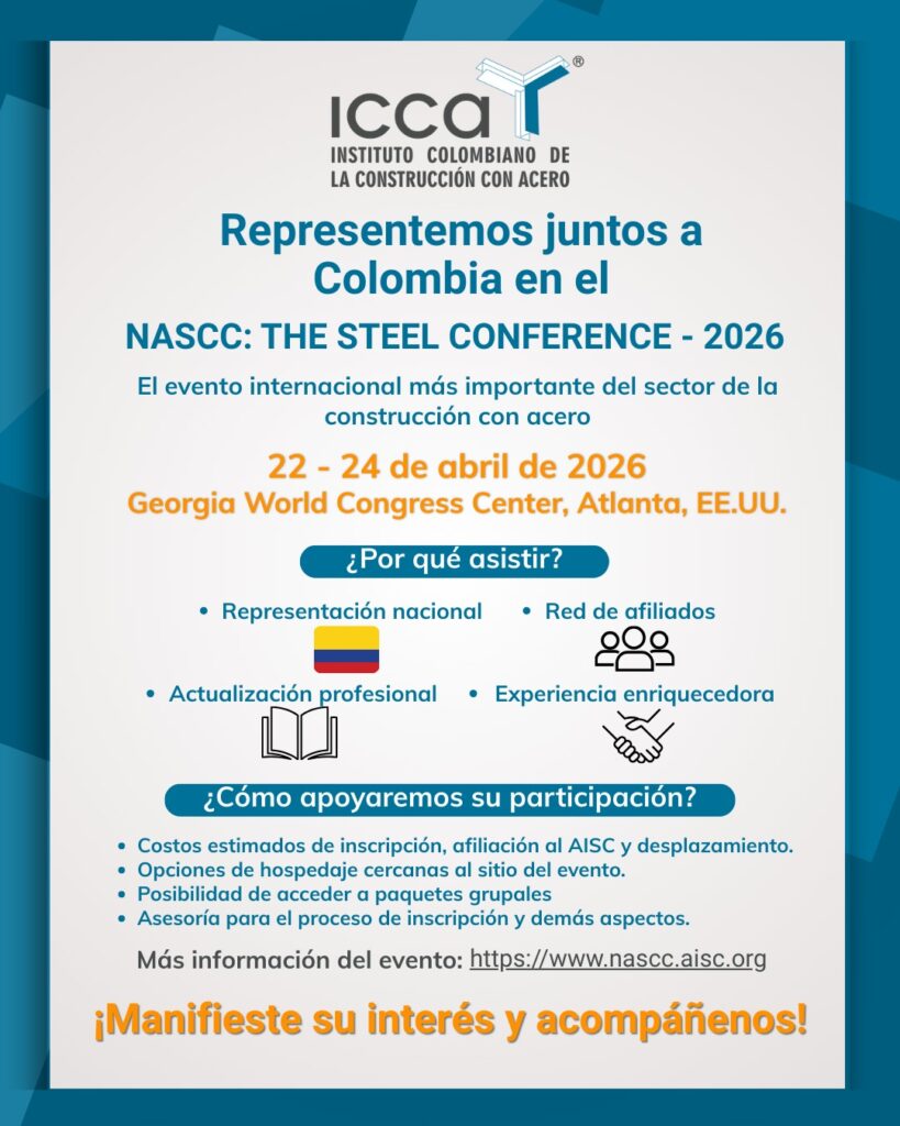 Desde el Instituto Colombiano de la Construcción con Acero – ICCA, extendemos una cordial invitación para que nos acompañe al NASCC: The Steel Conference 2026, el evento internacional más importante del sector del acero estructural, que se llevará a cabo del 22 al 24 de abril de 2026 en el Georgia World Congress Center, Atlanta, EE.UU.